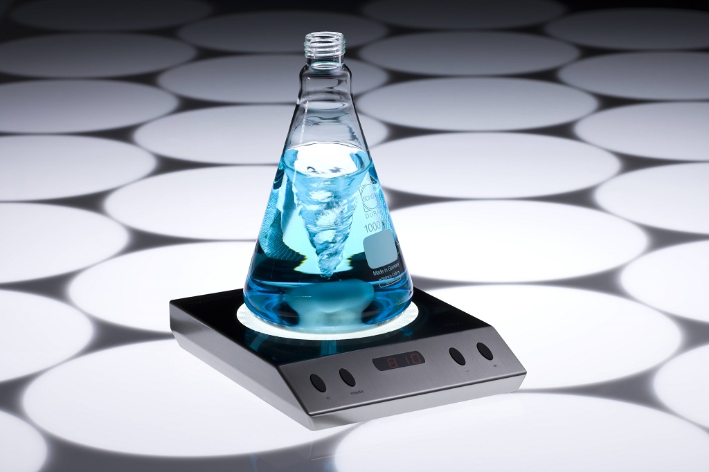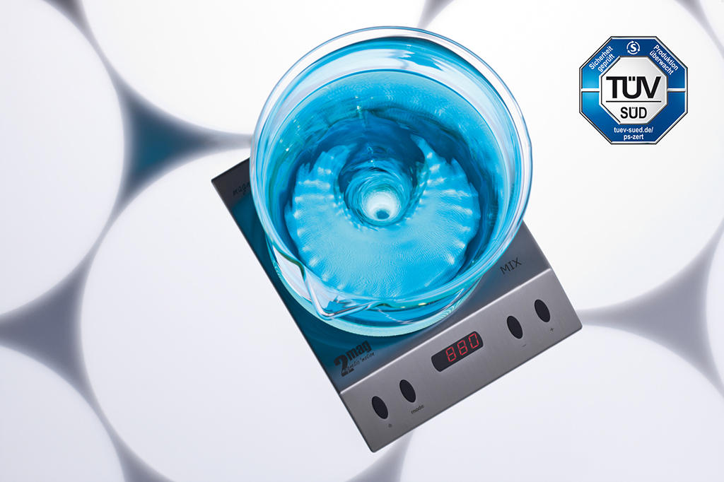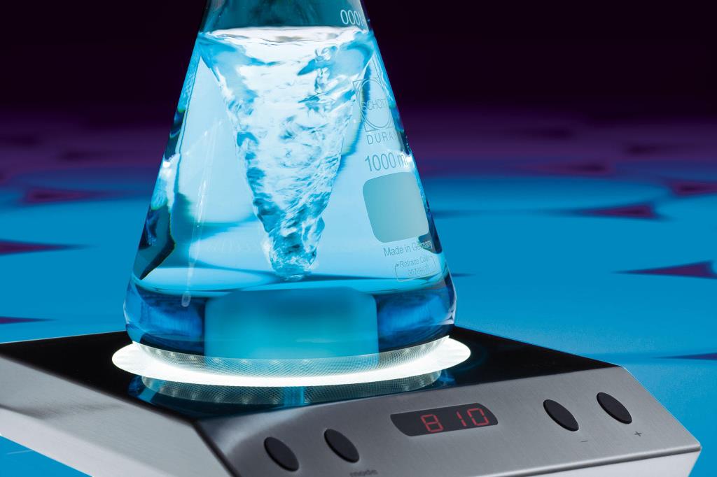 Rühren – 100% verschleiß- und wartungsfreier 2mag-Induktionsantrieb für kraftvolle Durchmischung von Lösungen, breiter Drehzahlbereich von 100 bis 2.000 rpm, ruckfreies Rühren auch bei niedrigen Drehzahlen, Leistungseinstellung (4-stufig) für hohe Leistung bei großen und viskosen Rührmengen und reduzierte Leistung für den erwämungsfreien Dauerbetrieb.