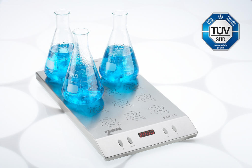 Ultraflacher, verschleißfreier 2mag Magnetrührer mit 15 Rührstellen, optimiert für gleichzeitiges Arbeiten mit 15 x 250 ml Bechergläsern (hohe Form).