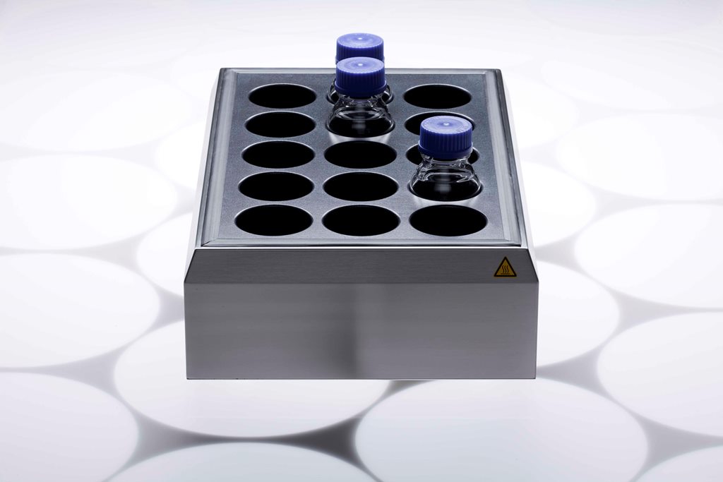 2mag Rührheizblock-System mit 15 Bohrungen, ø 71,5 mm, Tiefe 78 mm, Abstand 84 mm, optimiert für 250 ml Laborflaschen und für 400 ml Bechergläser (hohe Form).