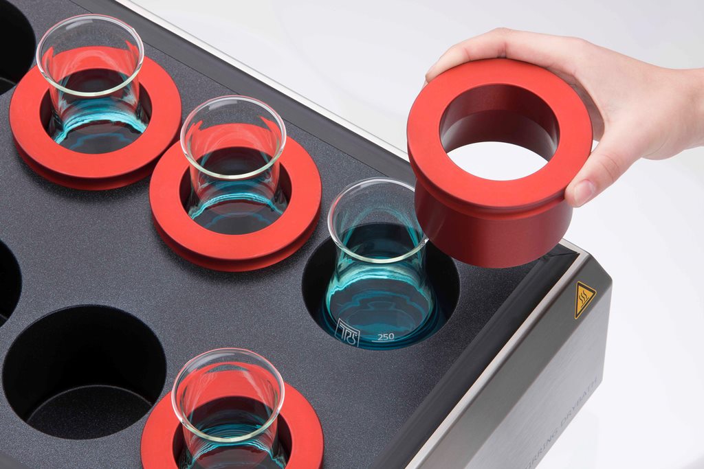 Heizen – Massiver, einteiliger Heizblock gefertigt aus resistenter Aluminiumlegierung, PTFE-beschichtet zur Erhöhung der chemischen Beständigkeit und leichteren Reinigung, Kontakthülsen für einen optimalen Temperaturübergang, integrierte elektrische Heizung, maximale Heiztemperatur +200 °C. PowerDetect zur automatischen Kompensation von physikalisch bedingten Rührleistungsverlusten, die bei hohen Temperaturen bis zu 40% betragen können, kleinster möglicher Temperaturgradient in den Probengefäßen durch verlustarme, allseitige Energieübertragung auf das Gefäß.